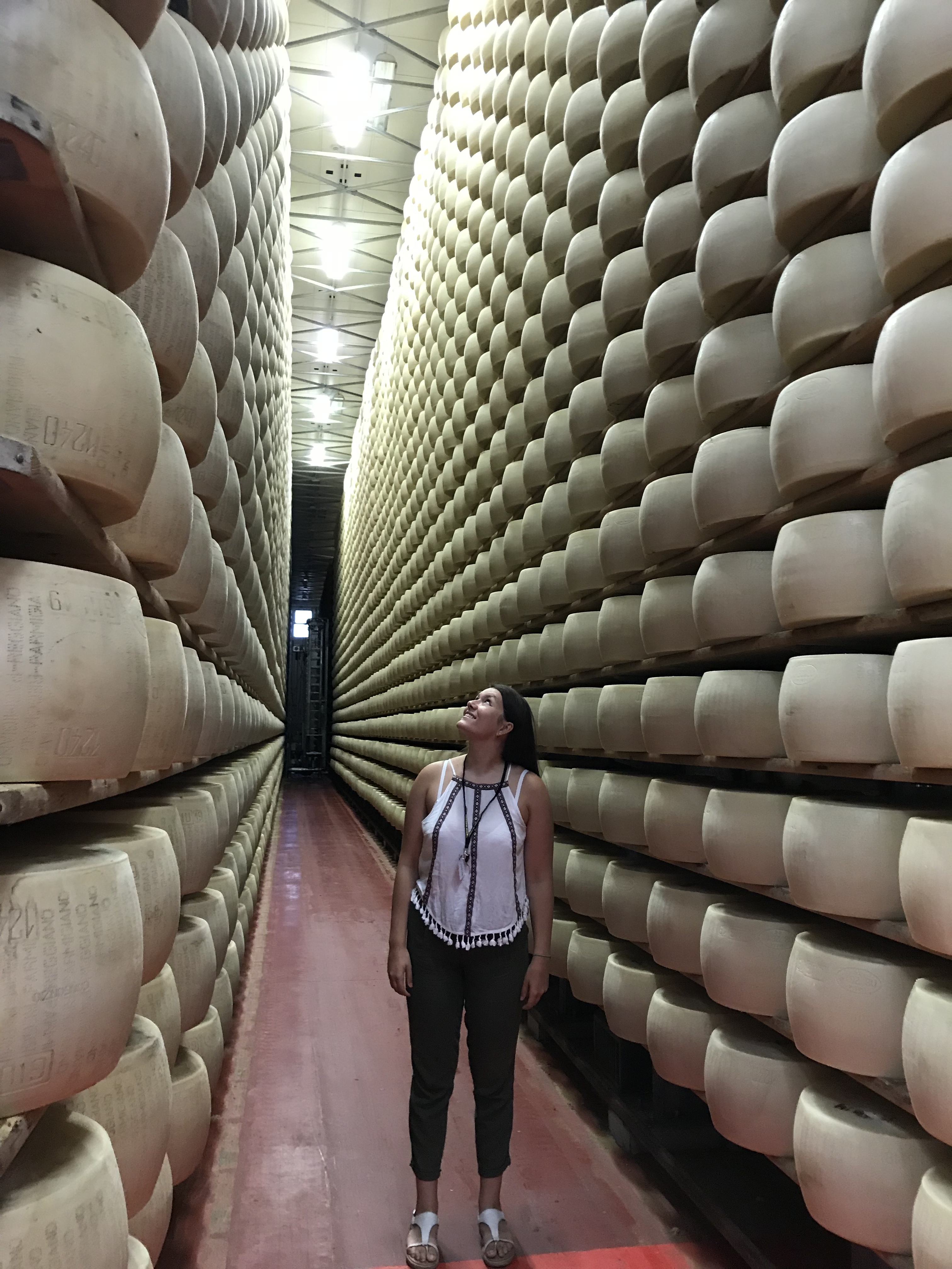 J’ai aussi eu l’occasion de visiter une fabrique de parmesan, 4 Madonne. Le nom Parmigiano Reggiano vient du nom des villes où il à été inventé, entre Parma et Reggio Emilia. La fabrication du fromage et son appellation sont donc restreintes à la région d’Emilie-Romagne. Il n’y a que 4 races de vache qui produisent le lait pour le parmesan et ces vaches sont nourries exclusivement avec de l’herbe et du foin de la région, tout est très contrôlé. Avant que le parmesan arrive dans notre assiette il faut être patient, l’affinage dure de 12 à 30 mois.