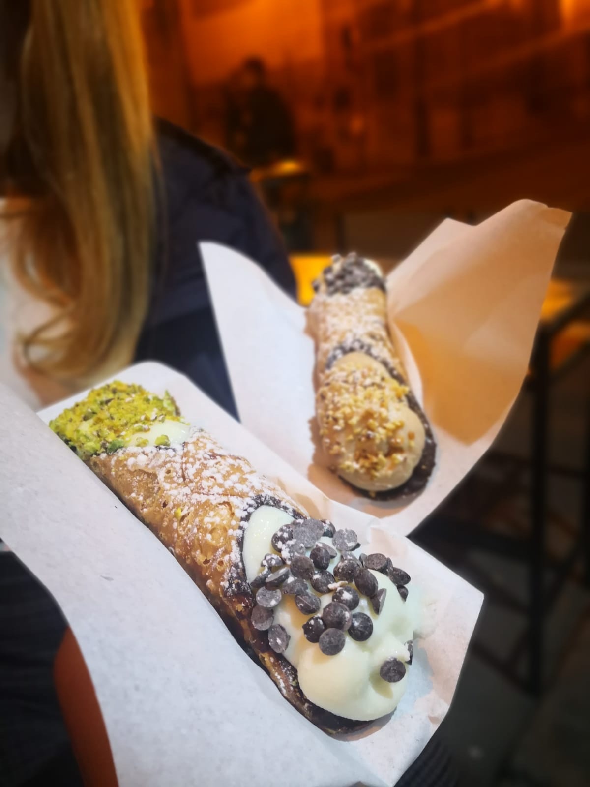 La nourriture a été un point important du voyage, j’ai pu découvrir le dessert typique de Sicile, les Cannoli Siciliani. Le cannolo est un rouleau de pâte fris dans un bain de friture pour le rendre croustillant. Il est garni d’une crème de ricotta sucrée originellement parfumé à la vanille, aujourd’hui on en trouve parfum pistache noisette ou chocolat… et on y ajoute des pépites de chocolat. Il est généralement décoré avec une écorce d’orange, de la pistache ou encore du chocolat. C’est délicieux!