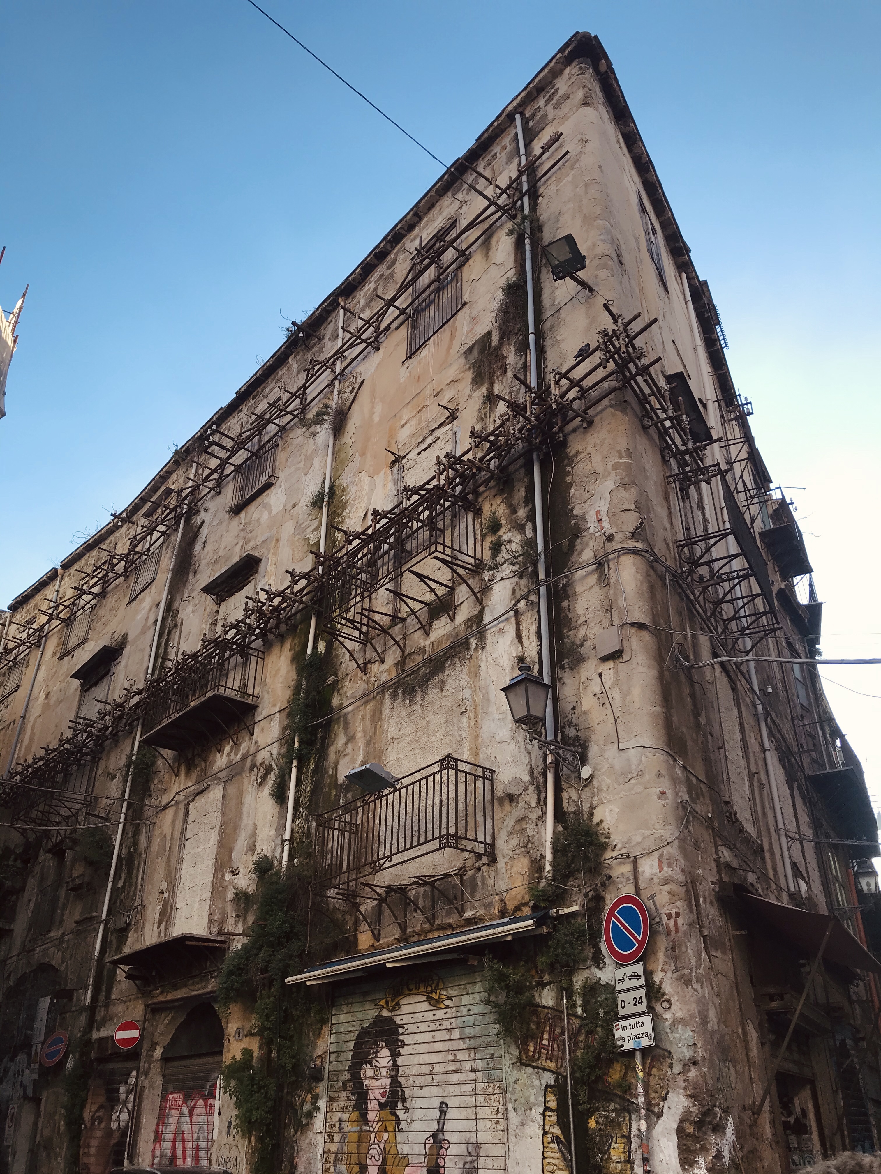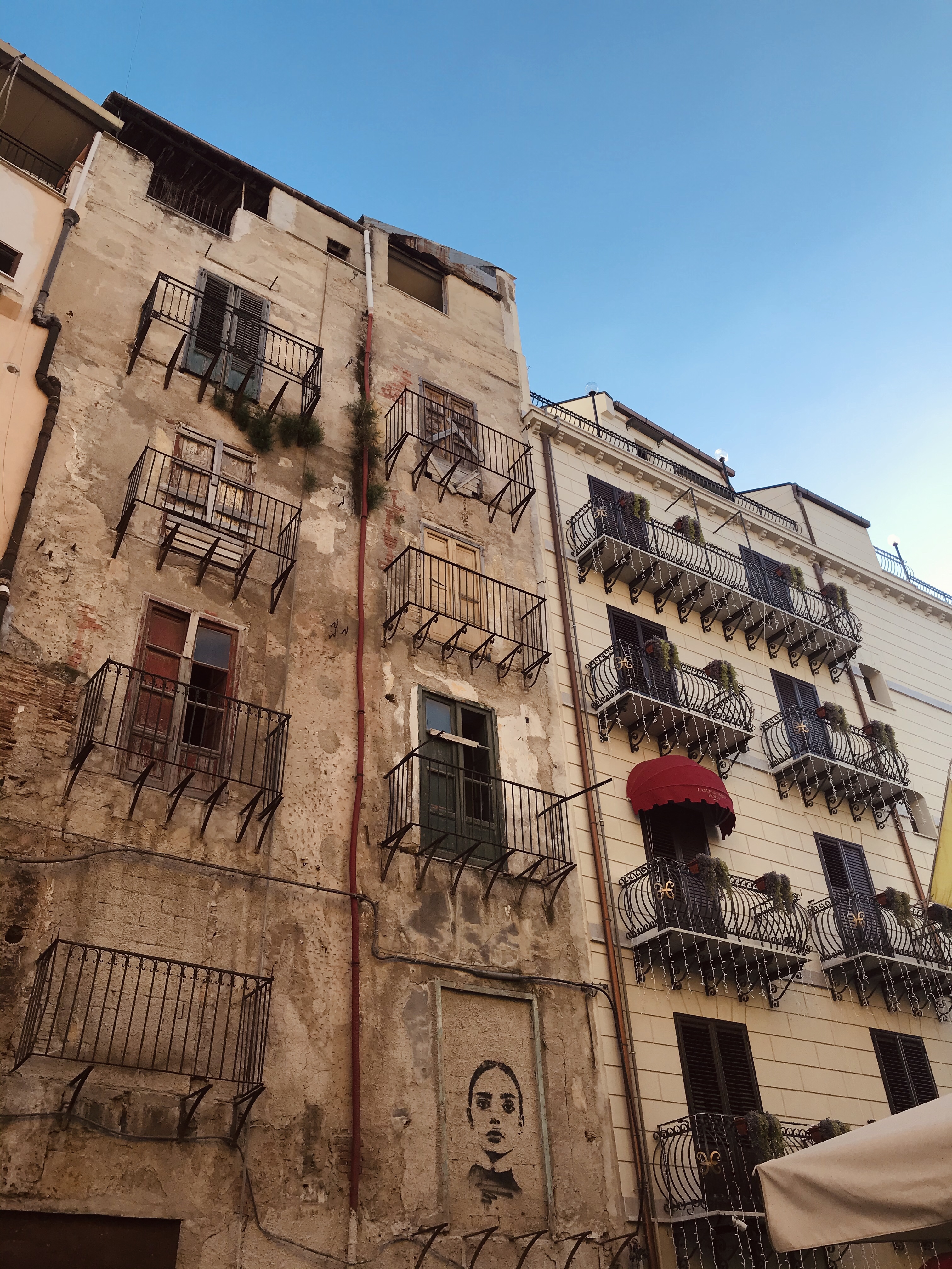 En déambulant dans les rues j’ai été impressionnée de voir qu’une si grande ville (Palerme est la plus grande ville de Sicille avec près d’un million d’habitants) puisse avoir en son cœur tant de bâtiments à l’abandon. D’une rue à l’autre on a l’impression de changer de ville, on admire de magnifiques églises et l’instant d’après on se retrouve dans une ville fantôme avec des bâtiments délabrés. Cette sensation est très étrange, comparé aux centre villes historiques qui sont très attractifs dans les villes en général, ici c’est totalement l’inverse. Le développement économique et social de la ville a été freiné dans les années 1960 et 1970 par les activités de la Mafia. Palerme est tristement célèbre pour ses multiples règlements de compte entre clans mais reste marquée par les actions des juges Giovanni Falcone et Paolo Borsellino, assassinés en 1992. Ainsi on peut observer une immense œuvre de street art au port de Palerme représentant les deux juges.