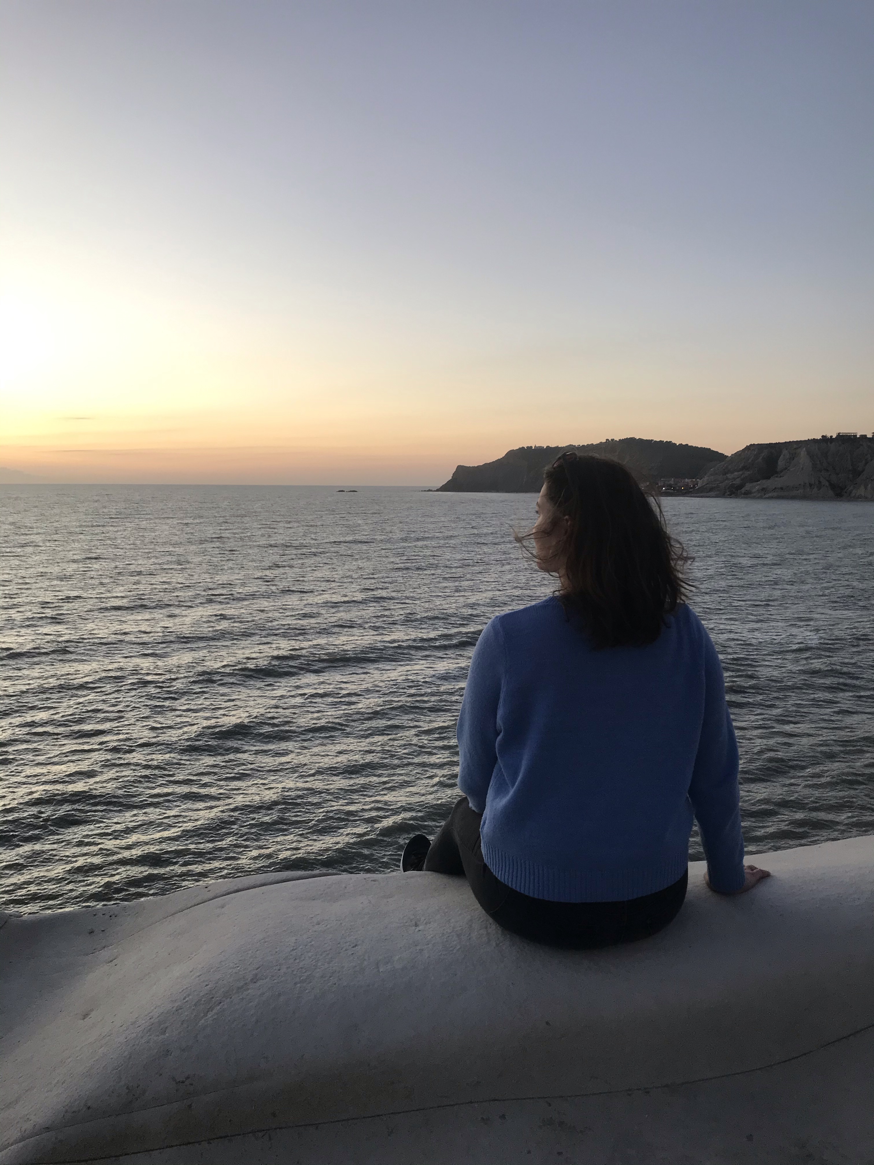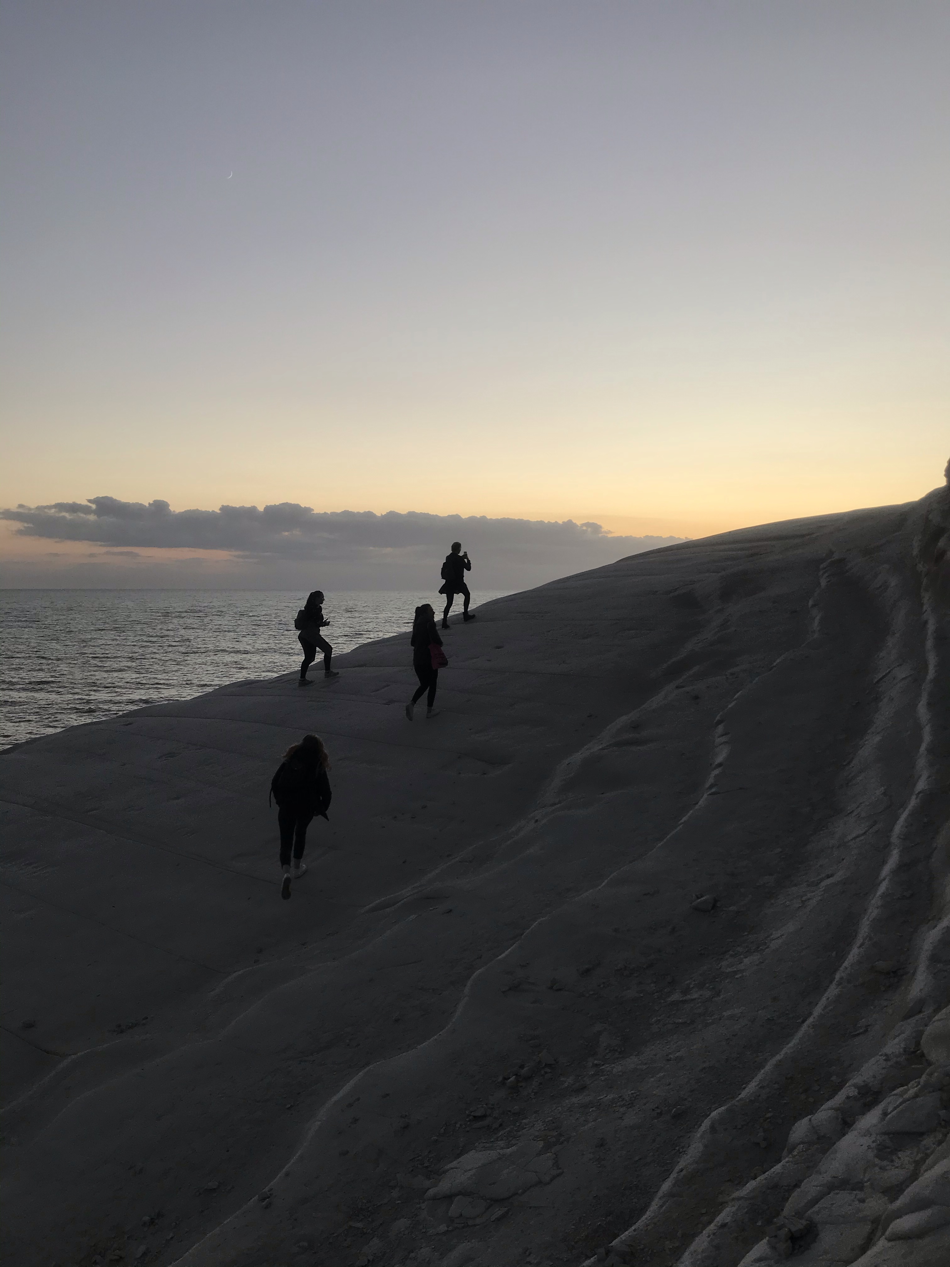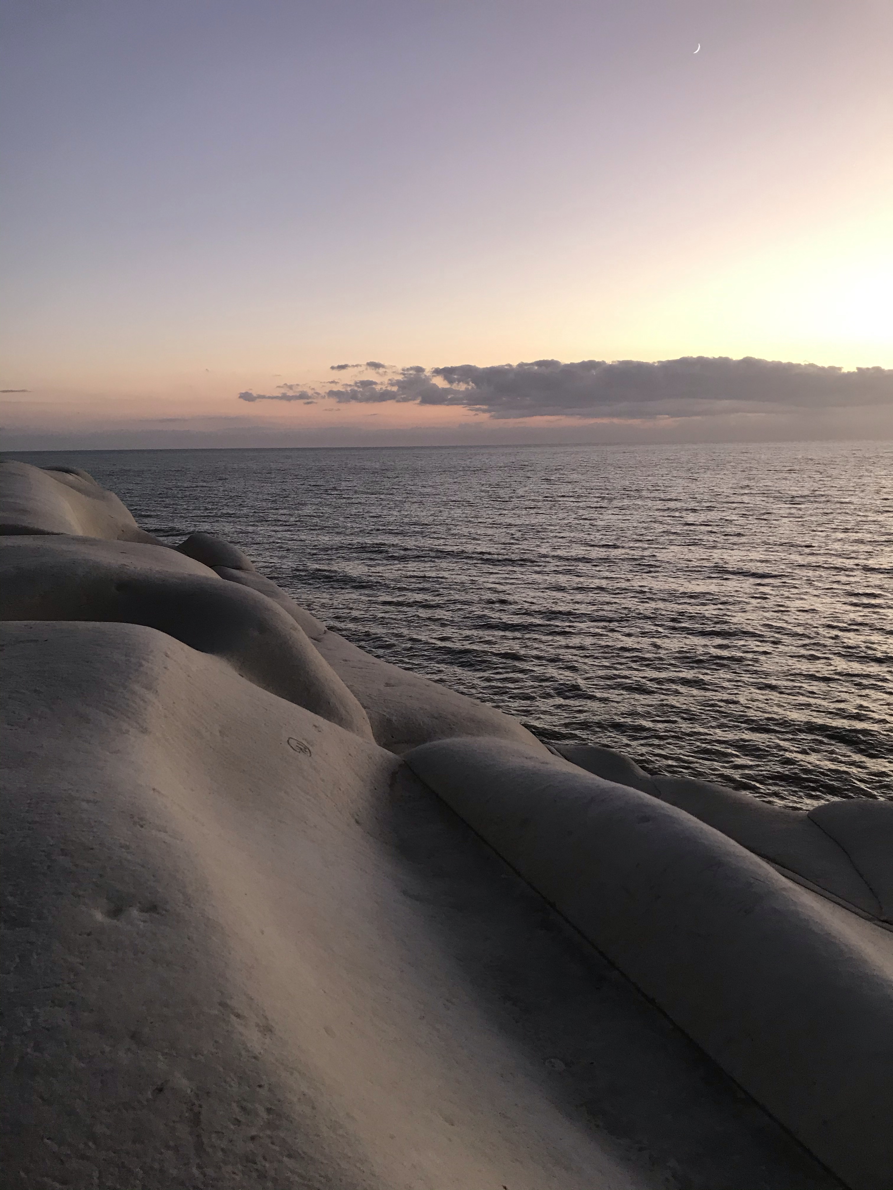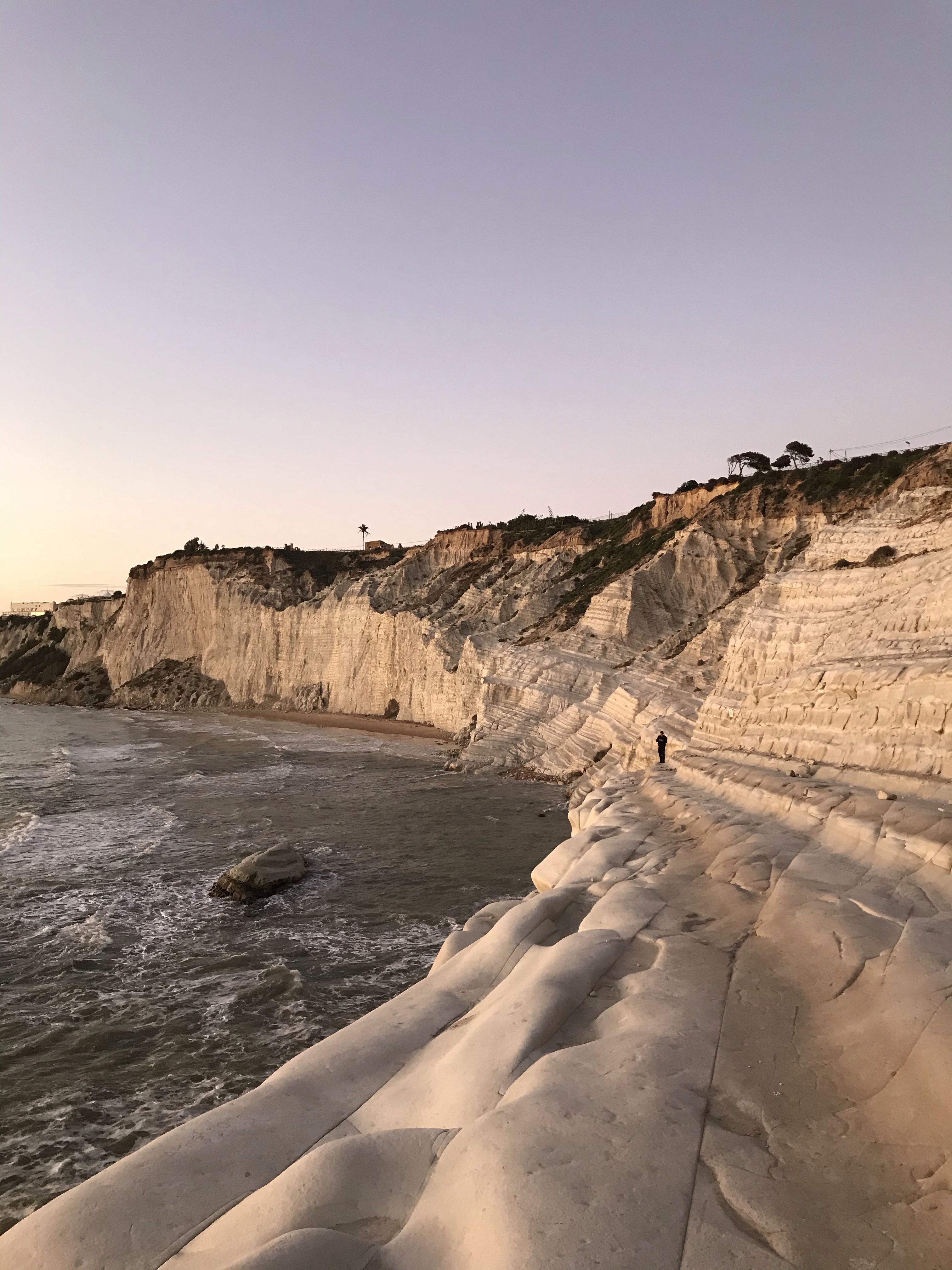 Nous sommes ensuite allés voir le couché de soleil à la Scala dei Turchi, c’est une falaise de calcaire blanc qui plonge directement dans la mer, l’érosion et le vent ont sculpté des « marches » et des courbes sinueuses, c’est un paysage magnifique.